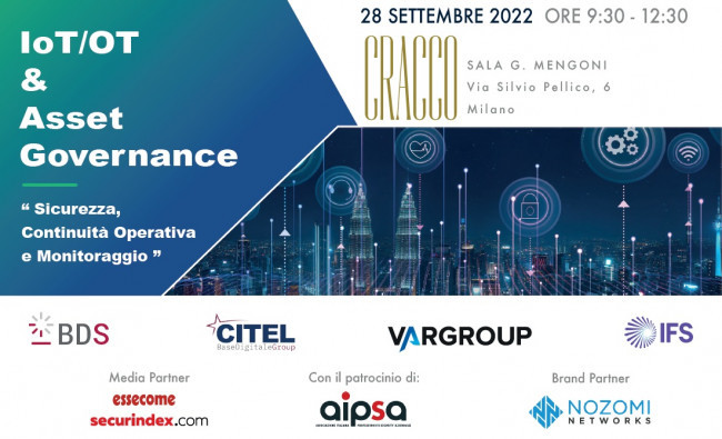 Il 28 Settembre 2022 si terrà in presenza presso la Sala Mengoni (Ristorante Cracco - ingresso via Silvio Pellico, 6 - Milano) e da remoto tramite la piattaforma streaming di securindex, il primo evento sponsorizzato da Citel, Vargroup e IFS sul tema della gestione dei rischi e della messa in sicurezza in ambienti IoT/OT a livello di best practice.