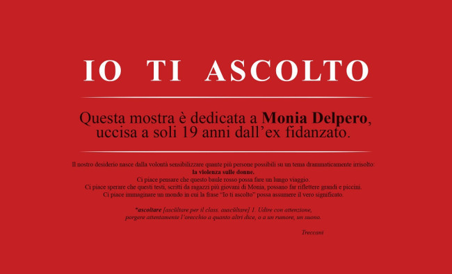 DAB Sistemi Integrati ha organizzato una mostra itinerante dedicata a Monia Delpero, uccisa a soli 19 anni dall’ex fidanzato e ritrovata dopo tre giorni tra i campi di Manerbio. La mostra, intitolata "IO TI ASCOLTO", è stata inaugurata oggi presso la sede di DAB Sistemi Integrati e l’esposizione resterà in azienda per 15 giorni.